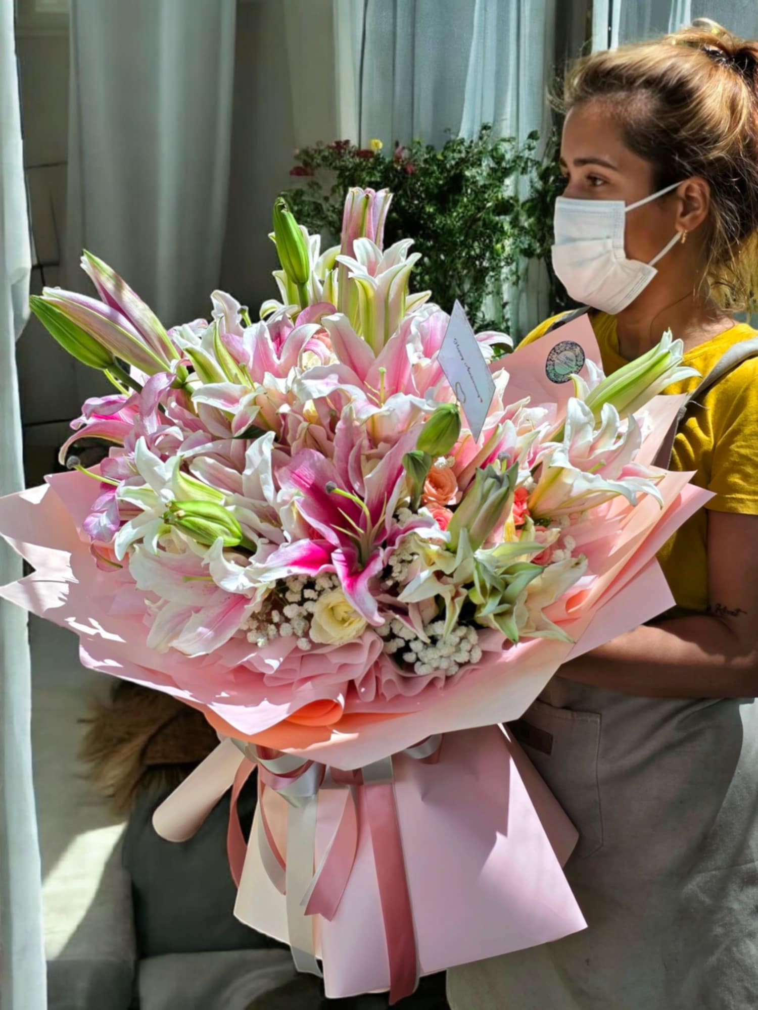 Elevate any occasion with the "Blush Lily Embrace," a premium bouquet expertly crafted with a lush combination of roses and lilies. This grand arrangement showcases the delicate beauty of blush-toned lilies intertwined with elegant roses, offering a sophisticated and timeless floral statement. Perfect for expressing heartfelt sentiments, its generous size and refined selection ensure a lasting impression of grace and luxury.