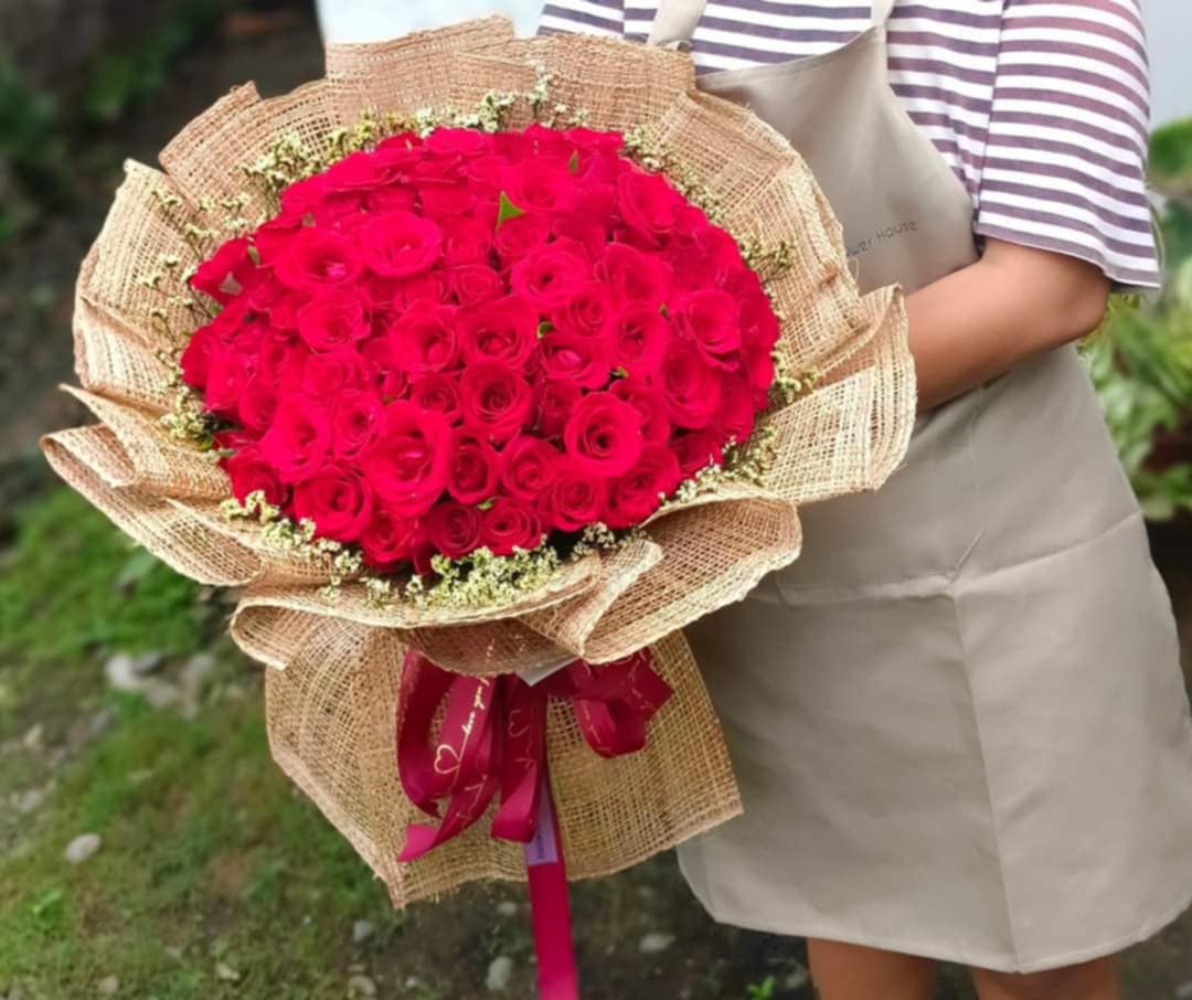 This elegant bouquet features five dozen fresh red roses, expertly arranged and wrapped in a native-style wrapper that highlights their natural beauty. Perfect for expressing deep affection or making a grand romantic gesture, this classic arrangement combines timeless elegance with a touch of local charm. Ideal for special occasions or meaningful celebrations, it delivers a stunning visual impact and lasting impression.
