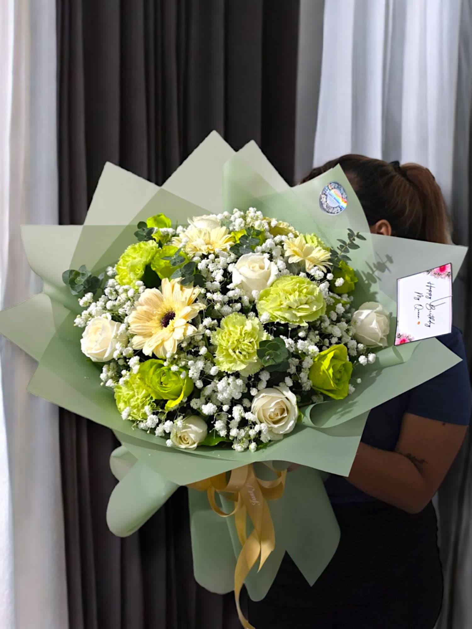 "Lemonade Daydream" is a refined bouquet featuring delicate daisies, pristine white roses, and vibrant green carnations. This harmonious blend offers a fresh and elegant aesthetic, perfect for conveying sincerity and cheer. Ideal for both celebratory occasions and thoughtful gestures, its balanced color palette brings a natural, uplifting charm to any setting.