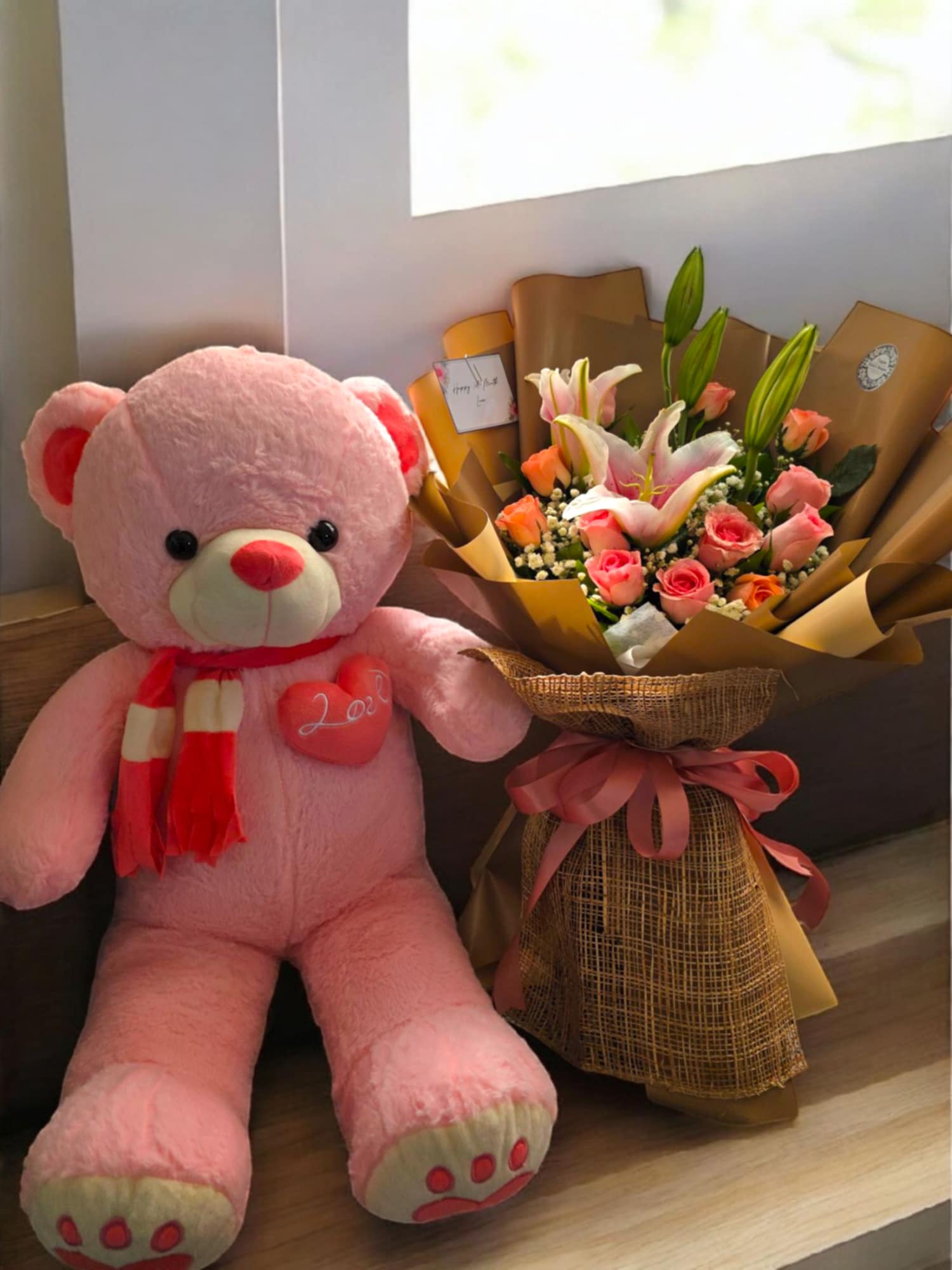 Combine the warmth of a cuddly teddy bear with the timeless beauty of roses and lilies in this expertly arranged bouquet. "Snuggle & Petals" offers a harmonious blend of soft textures and elegant blooms, making it an ideal gift to express affection and care. The inclusion of lilies adds a touch of sophistication, while the teddy bear provides a comforting keepsake, perfect for brightening any special occasion.