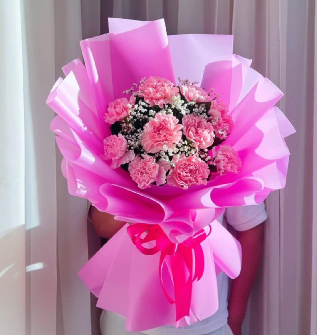 This elegant pink carnation bouquet, complemented by delicate gypsophilia, offers a refined blend of softness and texture. The carnations provide a lasting bloom with gentle hues, while the airy gypsophilia adds a light, romantic touch. Ideal for conveying admiration and affection, this arrangement suits both formal occasions and intimate moments, showcasing expert floral design that balances color and form with natural grace.