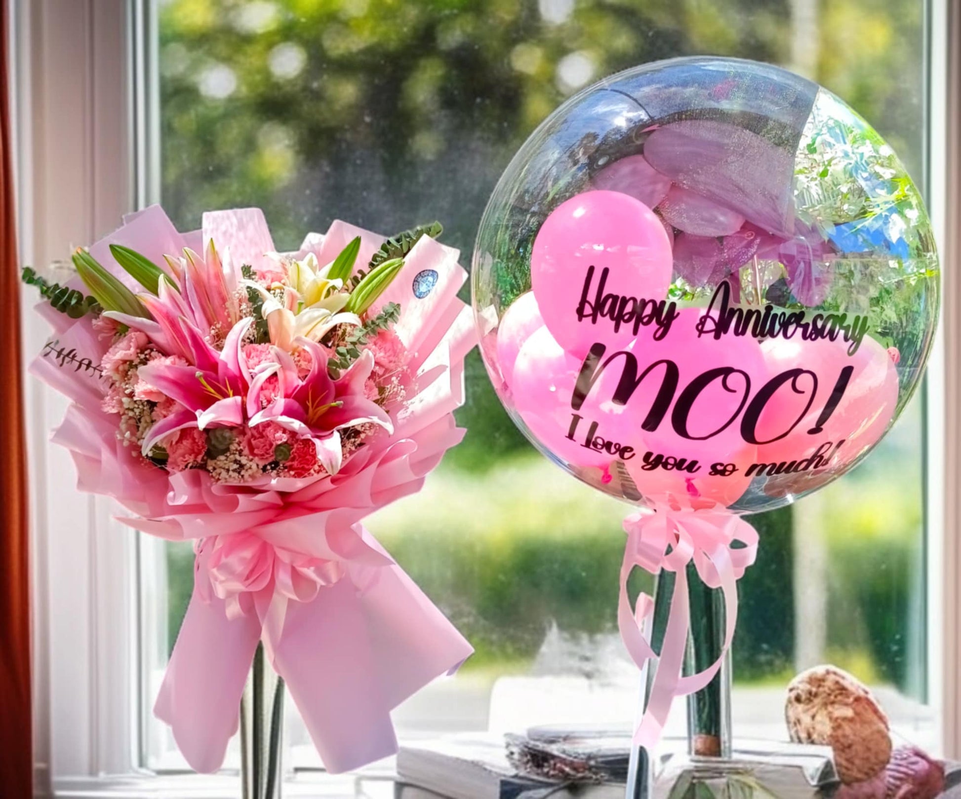 Celebrate your special moments with the "Sweetheart Serenade" bouquet, featuring elegant lilies and carnation paired with a customizable balloon. This expertly arranged floral gift allows you to add a personal dedication, making it a thoughtful and unique expression of your sentiments. Perfect for anniversaries, birthdays, or heartfelt surprises, it combines classic beauty with a personalized touch to create lasting memories.